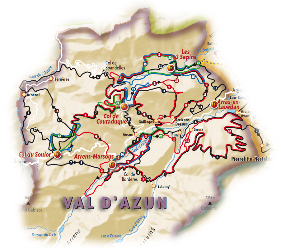 Les départs des 23 circuits s’effectuent par 5 portes réparties dans la vallée entre Montgaillard, Bagnères de Bigorre et Payolle et représentent 373 km.