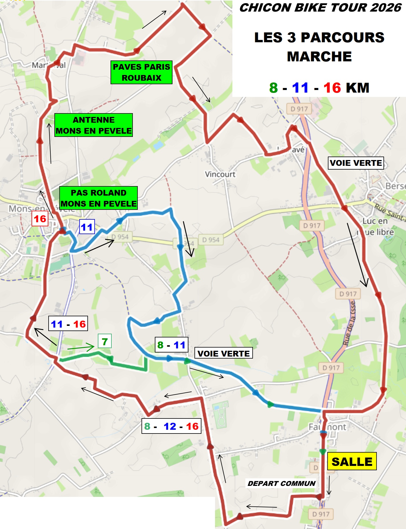 Comme tous les ans, les parcours MARCHE vont être remaniés. Par rapport à l’édition 2026, le sens des tracés sera à l’envers avec de nouveaux passages. 3 distances vous seront proposées : 8, 11 et 16 km. Par manque de bénévoles, il n’y aura toujours pas de ravitaillement pour vous, mais chacun aura droit à une bouteille d’eau et une collation (une excellente gaufre) aux inscriptions à la salle. Comme à chaque fois, une onctueuse soupe aux chicons vous réchauffera à la salle, ainsi qu’un sandwich et une boisson. Un sachet de chicons vous sera également offert pour retourner chez vous.