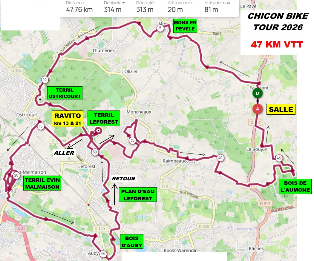 Pour les plus sportifs d’entre-vous, un parcours (non officiel) de 60 km est aussi possible en reprenant la première partie GRAVEL dans la forêt de Phalempin, puis en suivant le 47 km VTT (avec la montée des 2 terrils et le plan d’eau de Leforest) après le premier ravito. Comme pour le 47, il y aurait un second passage au ravito au km 45.Voici la carte KOMOOT qui vous donnera une idée du défi (carte Openrunner ici) : |